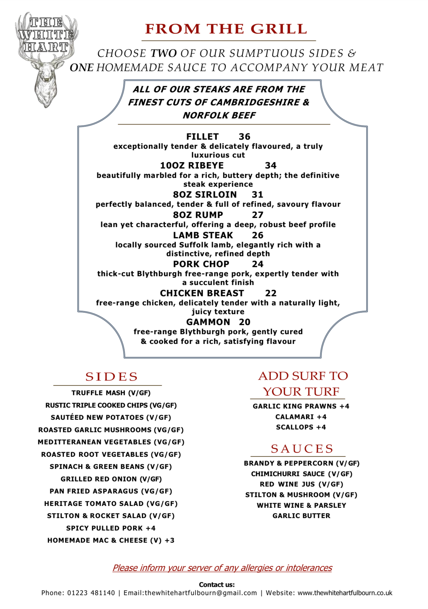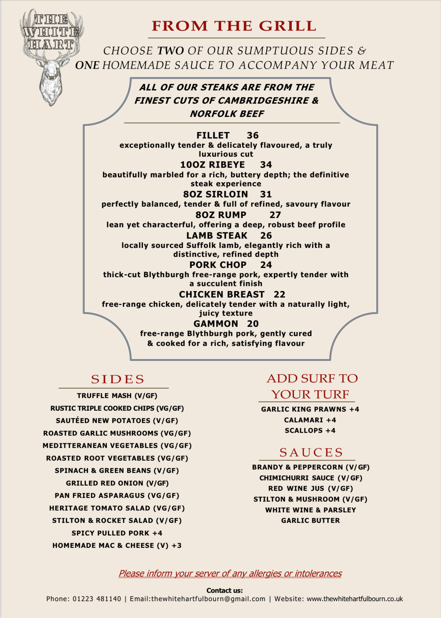 We are a family run premium steak and fish restaurant in the idyllic village of Fulbourn, South Cambridge. Located just 15 minutes from Cambridge, 13 minutes from Duxford airfield and 17 minutes from Newmarket Racecourse, with ample customer parking. We pride ourselves on offering a fresh farm to fork menu, sourcing our ingredients from UK Fishmongers and Fulbourn’s butchers.